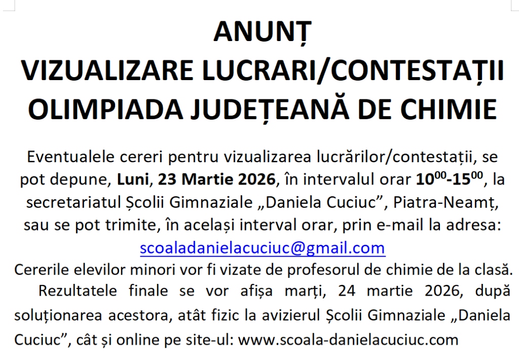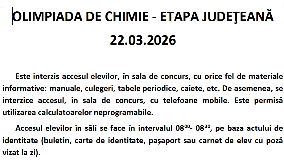 Olimpiada de Chimie – Etapa Județeană – 22 martie 2026