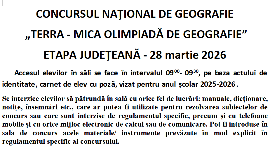 Concursul Național de Geografie „TERRA – Mica Olimpiadă de Geografie” Etapa Județeană 28.03.2026
